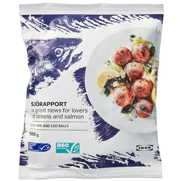 Si no te gustan las albóndigas de carne, deberías probar las albóndigas SJÖRAPPORT de venta en Ikea. Están hechas con salmón y bacalao, hecho para darle más sabor y consistencia a este producto, Además, tiene el estándar ASC de acuicultura responsable.