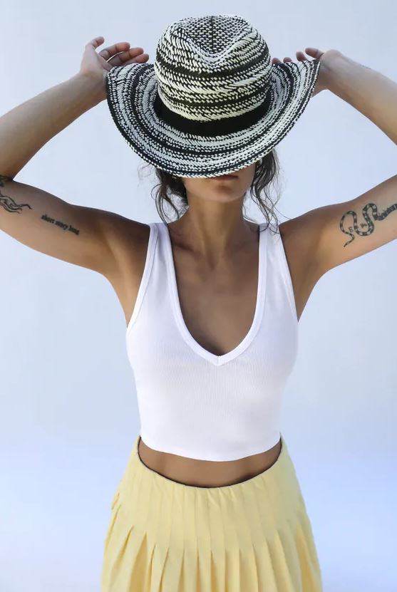El último accesorio femenino de la lista es este sombrero trenzado. Se trata de un sombrero compuesto por un 100% de pasta de celulosa, formando trenzados de colores blanco y negro. Sin duda, será un accesorio que te dará un toque de estilismo al look veraniego.