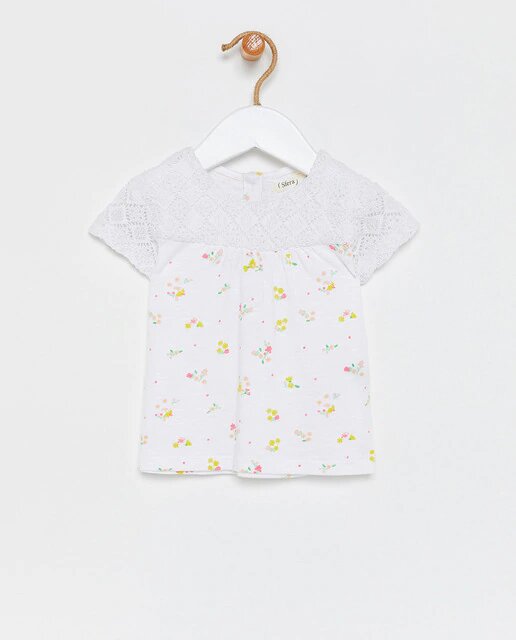 Para terminar con esta lista de prendas de marca de El Corte Inglés en rebajas, tenemos esta camiseta para bebés con estampado de flores y detalle de crochet en mangas y parte superior.