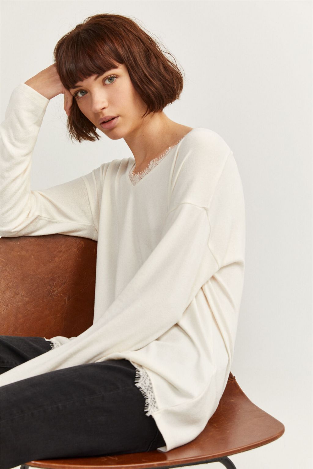 Este modelo presenta un diseño simple, con manga larga, cuello de pico, y un detalle de lace con punto cortado. Creado en 95% de poliéster y 5% de elastano.