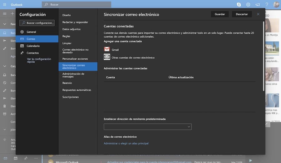 Cuando ya hayas configurado de forma correcta tu cuenta de Gmail, solo tendrás que dirigirte a la opción de Sincronizar correo electrónico que te aparece en el apartado Correo, la cual está dentro de la configuración Outlook. Además, debes añadir tu dirección de Gmail para poder sincronizar los correos con Outlook. Para encontrar los correos, se creará una carpeta con el mismo nombre que tiene tu dirección de correo.