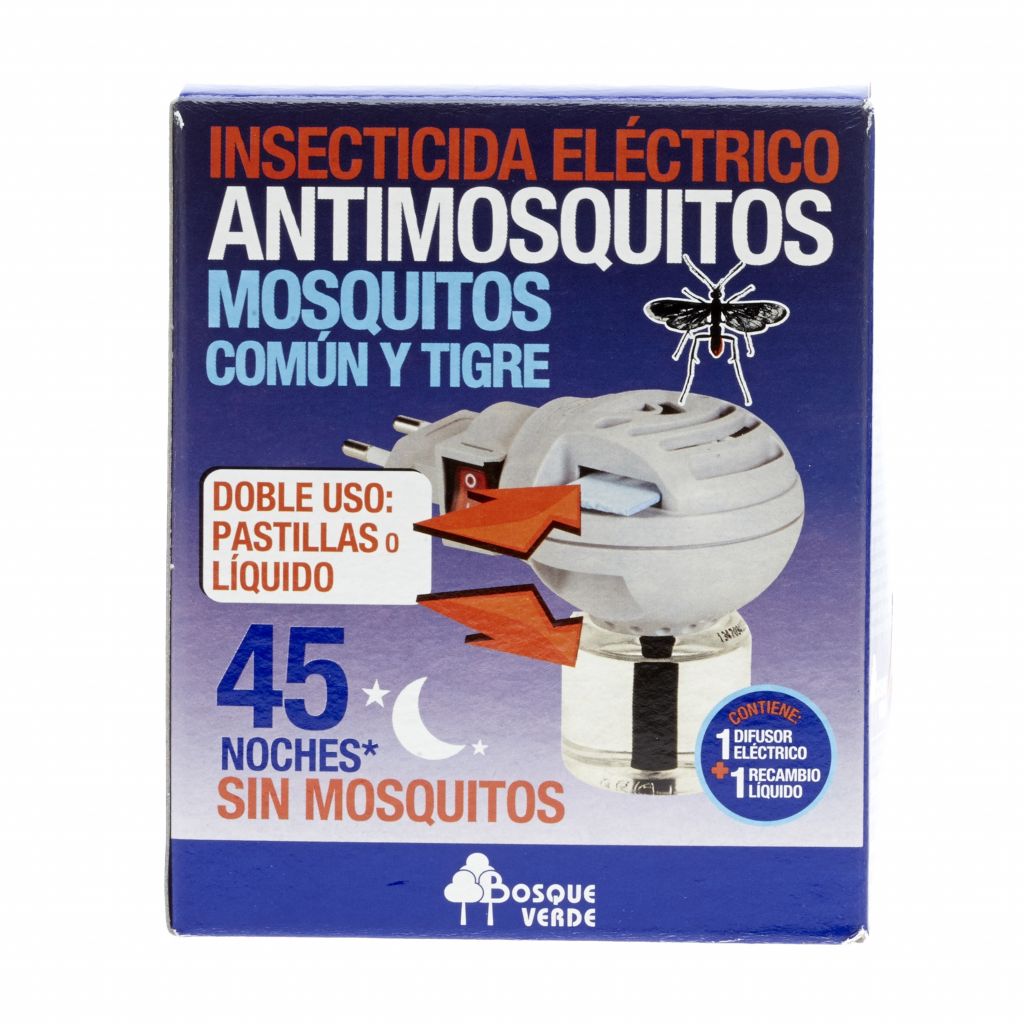 Bosque Verde tiene un gran producto, además tiene doble uso, ya que permite usar recambio líquido y recambio sólido. Lo que tú prefieras… Ambos son efectivos para el temido mosquito tigre, y su duración es de unas 45 noches. Si te preguntas cuál es mejor, lo cierto es que cada uno tiene sus ventajas y desventajas. Según algunos estudios, los de líquido suelen ser algo más efectivos, pero los de pastilla no generan ese vapor ni dejan mancha en el difusor. Según la OCU, el líquido es la mejor opción y la que menos riesgo implica para la salud.