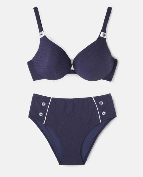 Se trata de un bikini con aro, foam y braga alta. Lleva tirantes fijos regulables y cierre con broche. Tiene un estampado liso y es un 92% de poliéster y 8% de elastano.