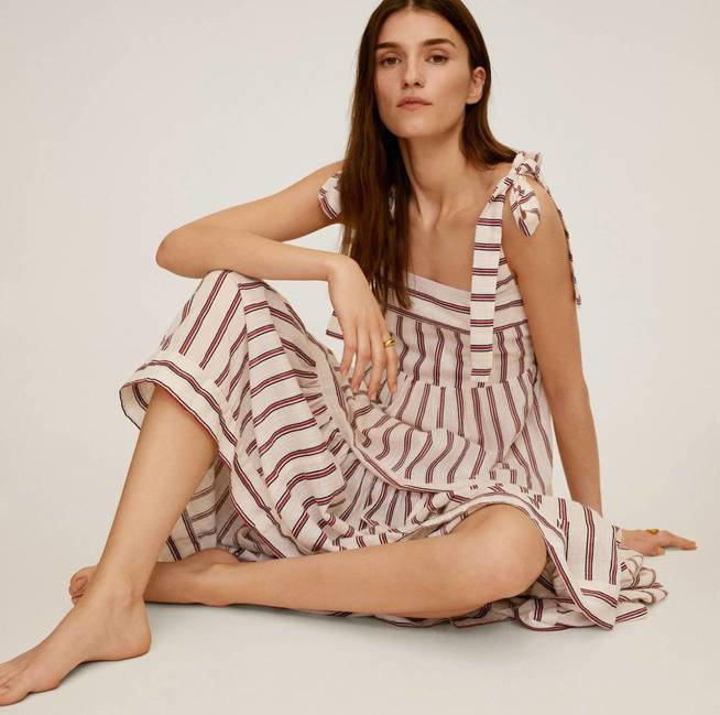 Decir verano es pensar en Ibiza y en cómo su estilo entre boho y bohemio ha conseguido cautivar a las grandes firmas como Mango que no dudan en incluir colecciones enteras inspiradas en sus telas, diseños y colores. Como este vestido que ha levantado auténticas pasiones y una locura inmensa por conseguirlo. ¿El motivo? Este vestido tiene todo lo que buscamos en la ropa de verano: un estampado original, a rayas, pero no marinero, en color crudo y rústico, con el toque de color de las rayas rojas que ha conquistado los corazones de las amantes del buen vestir. Su diseño acampanado y fluido, con falda de costuras y su escote recto y tirantes de lazada aportan un estilo fresco, atrevido y muy cómodo para el verano.