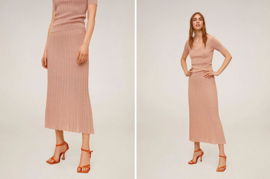Dejamos para el final otro de los hits del verano en Mango: esta falda de punto midi plisada que está levantando pasiones incluso entre quienes reniegan de las faldas largas o midi. Es sencilla pero tremendamente elegante. Aunque tiene un corte tubular, no es incómoda para caminar y se puede combinar casi con cualquier tipo de blusa, camisa o top. Como todo en esta temporada nos encontramos con un talle alto que remarca aún más su efecto tubular, pero con cierto aire y gracia.