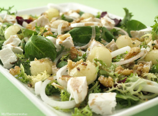 Aunque de entrada una ensalada con melón pueda parecer algo extraño, no hay aperitivo de verano más mítico que el melón con jamón, así que nada de escandalizarse. Lo mejor de esta ensalada es la combinación del ácido del aliño con el dulce de la fruta y el punto salado del queso, así que dentro de estas coordenadas puedes darle uso a la imaginación.