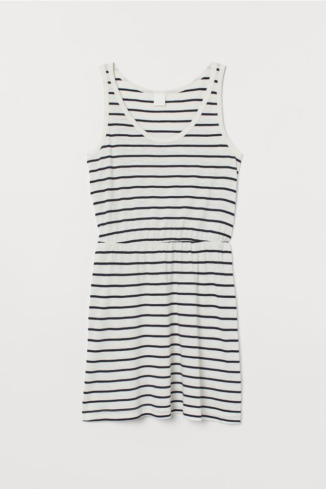 Se trata de un vestido corto en punto suave de modal hecho con algodón, la mejor para el calor del verano. Es un modelo con escote profundo y costura elástica en su cintura para marcar figura. Para empezar, tienes un modelo completamente en negro, otro también en negro, pero con estampado, y en último lugar el que tiene una gran rebaja. Es un modelo en color blanco con rayas horizontales también en negro.