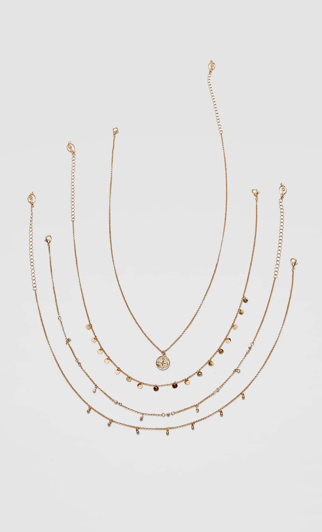 Sin duda alguna, los collares están de moda, pero cómo les cuesta a las damas encontrar unos que les vaya a sus estilo. Pues como es de esperarse Stradivarius tiene los mejores asesores para guiarte en esas compras que tú necesitas de manera urgente. En este set de 4 collares de SRT, cuenta con monedas y cristales. No está nada mal pensar que con este tipo de joyas vas a poder verte como toda una celebridad, muy imponente, regia.