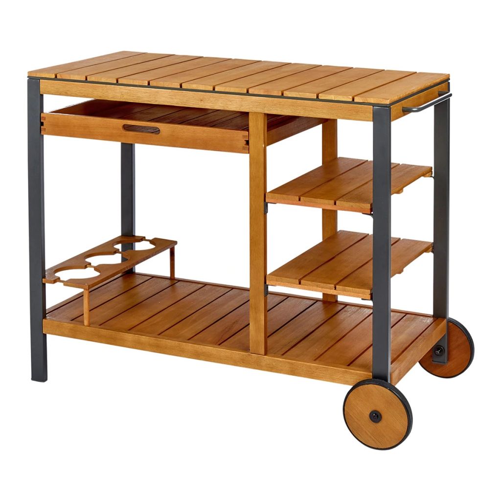 Está fabricado en madera de acacia y aluminio, por lo que es ligero y fácil de dirigir. Sus diferentes compartimentos y estantes te permiten almacenar menaje, vasos, botellas, etc.