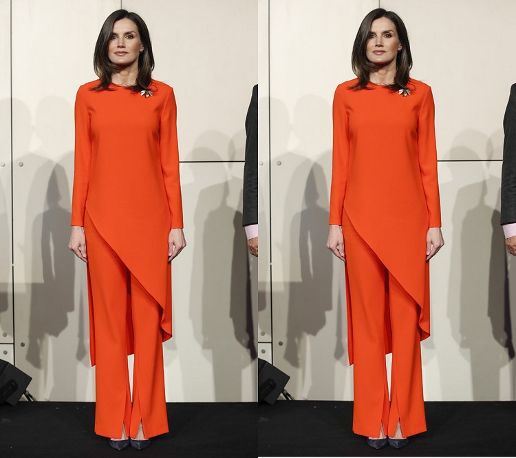 Para su visita a Argentina, la Reina volvió a contar con Zara para este conjunto naranja de dos piezas, combinado con un broche de ámbar con forma de abeja. El vestido arrasó, tanto en nuestro país, como en Argentina.