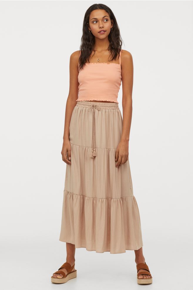 No podíamos seguir esta lista de ropa estilo boho de H&M sin incluir una maxifalda, y es que son las grandes estrellas de este look. Esta en concreto es vaporosa, la mejor de las opciones, de talle alto y con un elástico oculto y cordón para un mejor ajuste con borlas en la cintura.