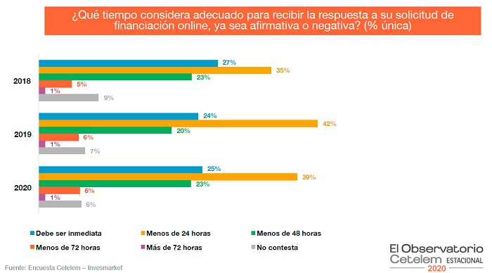 En lo que respecta a la valoración del tiempo de respuesta de las entidades de cara a una solicitud de financiación, hay un ligero aumento de los que se manifiestan más exigentes, y que declaran que la respuesta debe ser inmediata, pasando del 24% en 2019, al 25% en 2020. El grueso de respuestas está en aquellos que opinan que lo normal para obtener una respuesta, ya sea positiva o negativa sobre la solicitud de financiación de sus compras online, no debe ser superior a 24 horas (39% en 2020; 42% en 2019, y 35% en 2018). Por edades, los más exigentes son los más jóvenes (entre 18 y 24 años), que con un 31% de menciones, se sitúan 6 puntos porcentuales por encima de la media.
