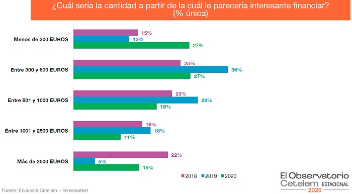 Según esta encuesta realizada por la unidad de estudios de Cetelem, marca comercial de BNP Paribas Personal Finance, hay otro 27% de los encuestados que financiaría compras en internet entre 300 y 600€ (36% en 2019, y 25% en 2018). Incremento considerable con respecto a 2019, es el dato de aquellos españoles dispuestos a financiar en sus compras online importes superiores a 2.500€, lo que supone un incremento de 17 puntos porcentuales con respecto a 2019 (5%) y 7 puntos porcentuales por encima de lo manifestado en 2018 (15%).