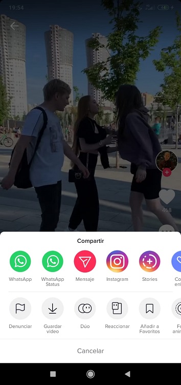 Podrás compartir el vídeo por mensaje, WhatsApp, Instagram o copiar el enlace. Además, permite descargar el vídeo sin ninguna aplicación externa (también como GIF) y las opciones “Dúo” y “Reaccionar”. En la primera opción, puedes hacer un vídeo que se ve a la vez que el vídeo de él a pantalla partida, como si fuera un dueto. En la segunda opción, puedes grabar tu vídeo reacción a la publicación, viéndose tu vídeo en pequeño y el suyo, en grande. Finalmente, podrás añadir el vídeo a favoritos, para verlo cuando quieras.