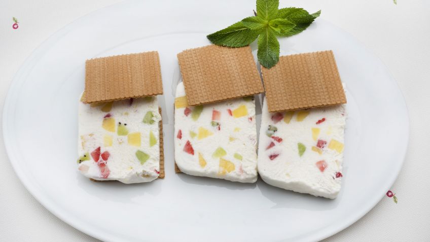 Ponemos la nata fría en un recipiente y la montamos un poco, añadimos el azúcar glas y seguimos montando pero no del todo. En un bol, batimos los yogures con la miel y lo mezclamos todo con la nata montada. Por otra parte picamos la fruta en trozos pequeños y lo incorporamos a la mezcla. Lo ponemos en un molde rectangular y lo guardamos en el congelador. Cuando vayamos a consumirlo, lo sacaremos del congelador media hora antes y lo dejaremos en el frigorífico. Para servirlo, lo desmoldamos y decoramos cada porción con galletas de barquillo y hojas de menta.
