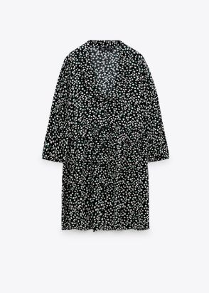 No puede faltar un vestido de flores en un armario veraniego. En Zara encontramos este con detalles de pequeñas flores sobre fondo negro, por lo que se puede combinar con todo (rebecas de cualquier color, zapatillas, zapatos, bolsos, sombreros…). Tiene un cómodo escote en forma de pico, solapa y manga larga. Se cierra por delante con botones pequeños. Está fabricado con un 50% de viscosa procedente del proyecto Join Life, que obtiene sus fibras de madera de bosques gestionados de manera sostenible donde se incluyen programas de reforestación. Además, el resto de la producción es respetuosa con el medioambiente. Puede ser tuyo por 29,95 euros.