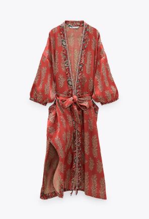 Si estás buscando una prenda verdaderamente espectacular, este impresionante kimono te está esperando en las perchas de Zara. Es de un bonito color teja estampado con motivos florales. Está fabricado con 61% viscosa y 39% liocel, largo y con manga 3/4 que termina con un elástico no muy apretado. En la parte delantera lleva unos bolsillos de plastrón y cierra con un cinturón hecho con en mismo tejido. Tiene dos aberturas laterales que lo hacen más cómodo. Llévalo con tacones o con unas cuñas elegantes y serás el centro de atención. El precio es de 59,95 euros.