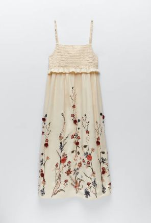 Este podría ser uno de los vestidos estrella de Zara de esta temporada, por la delicadeza de sus detalles, su corte y su mezcla de tejidos. Es de Locura en Zara: nuevos vestidos elegantes y económicos que lo ‘petan’ en distintos colores a contraste. Está fabricado en algodón y lino, y tiene un diseño que combina dos partes, ya que la de arriba está tejida en crochet, terminado con un volante en la parte baja del pecho, y la parte inferior es de lino fluido y suave. El escote es recto y elástico, y lleva unos tirantes finos y cómodos. Puede ser tuyo por 49,95 euros.