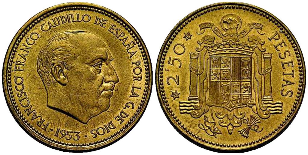 Otra de las monedas de peseta española cuyo valor te va a dejar con la boca abierta, es la moneda de 2,5 pesetas acuñada en 1953. En este caso, es una de las monedas más difíciles de encontrar, por lo que si tienes una estás de enhorabuena, ya que su precio de venta ronda los 1.500 a 1.700 euros.