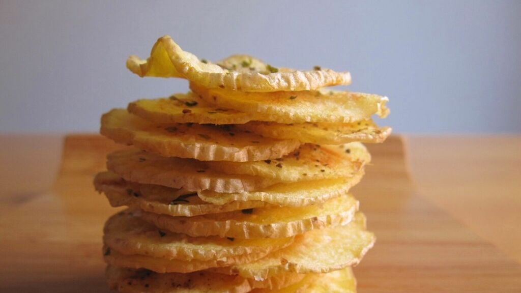 El microondas es otra alternativa para preparar patatas fritas saludables y con menos calorías. En este caso la propuesta son unas patatas chips caseras, muy rápidas y totalmente light. El primer paso es cortarlas con una mandolina. Esto es importante para que queden bien crujientes, aunque también podemos usar un cuchillo bien afilado con el que cortarlas muy muy finas. Podemos dejar la piel o retirarla, al gusto. Después dejaremos las rodajas en agua a remojo para que pierdan el almidón. Este truco siempre funciona y las patatas quedan mucho más crujientes. Cortamos papel de horno del tamaño de la bandeja del microondas y ponemos unas gotas de aceite de oliva encima. Disponemos las rodajas de patata, salpimentamos y ponemos el microondas a máxima potencia durante 6 minutos. Necesitaremos hacer un par de tandas para tener una o dos raciones de patatas. Además de conseguir un snack saludable, ni siquiera vamos a tener que manchar platos o sartenes.