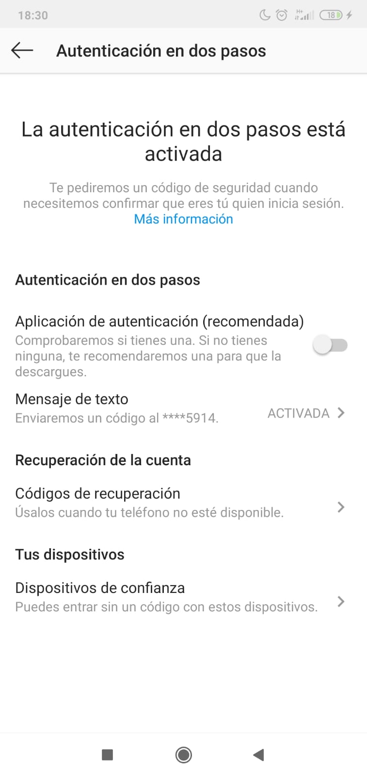 Para acceder a ella, de nuevo debes ir a la opción de “seguridad”, pinchando en esta ocasión en “autenticación en dos pasos”. Esta opción permite mandar un mensaje de texto a tu móvil con un código, el cual deberás dar cada vez que inicies sesión. Así mismo, tienes la aplicación de autenticación, la cual genera un código cada 60 segundos y que también se puede usar aquí. En el caso de que perdieras el teléfono, tienes unos códigos de recuperación que deberás apuntar.