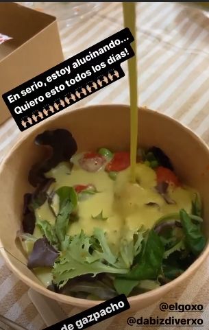 Así, la colaboradora comenzó su particular degustación con una ensalada de gazpacho en la que se puede ver cómo se prepara para comérsela. Junto a la imagen escribe: «En serio, estoy alucinando…quiero esto todos los días!«. Parece ser que debió quedar muy satisfecha, ya que a partir de aquí, no paró de subir más stories con los platos caseros del cocinero.