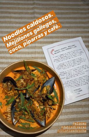La colaboradora calificó a través de unas stories en su cuenta de Instagram de «espectacular» o de diez, la Lasaña Mumbai del cocinero, a parte de probar unos Noodles caldosos, coco, piparras, mejillones caldosos y café, que según ella misma ha expuesto en la red: «Hoy estoy descubriendo sabores increíbles», tal y como puede verse ahora mismo en sus stories.