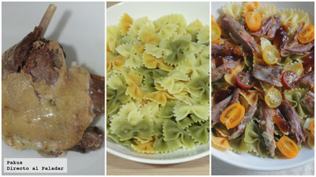 Colocamos la pasta en una fuente o ensaladera y la mezclamos con un chorro de aceite de oliva virgen extra. Después colocamos encima los trozos de confit de pato como si fuesen las horas de un reloj y espolvoreamos con los pistachos pelados que dan un aporte extra de proteína y fibra. En los huecos iremos colocando tomates cherry de colores cortados por la mitad y para finalizar rociamos con unos puntos de salsa Hoisin. La salsa Hoisin es típica de la cocina asiática y es similar a la salsa agridulce pero un poco más intensa.