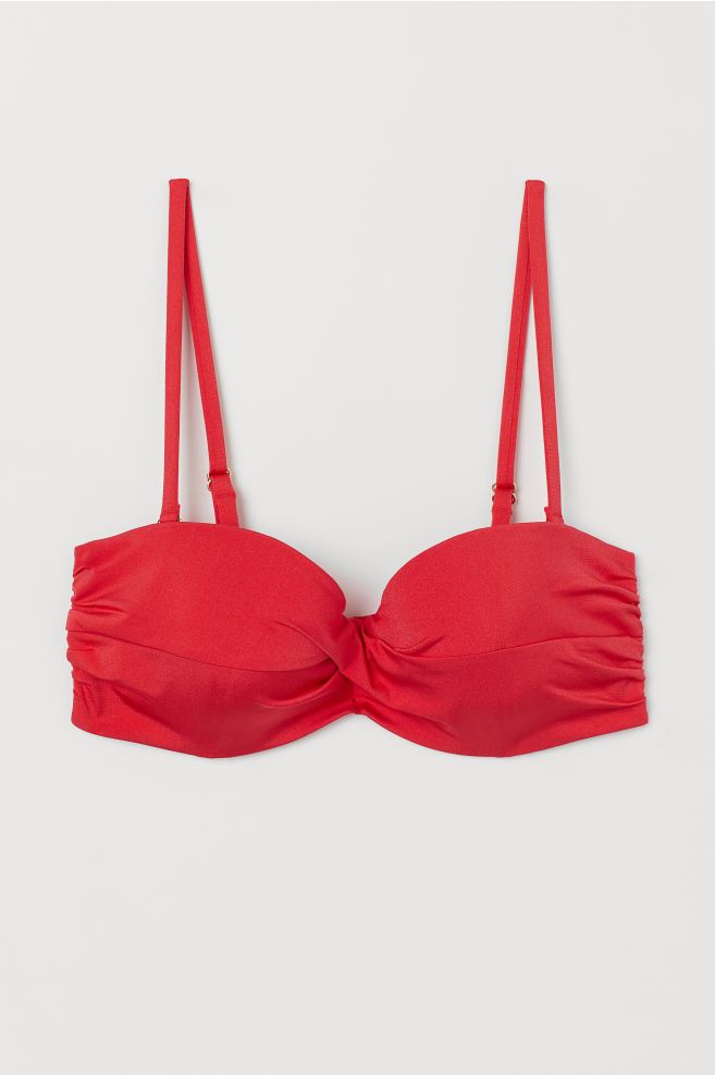 El sujetador estilo balconette es uno de los que mejor sientan y este de H&M, al tener copas acolchadas, da forma y realza el pecho, haciendo un escote muy bonito. Los tirantes son ajustables y se pueden extraer si prefieres tomar el sol sin ellos o simplemente si te apetece cambiar un poco. Para mayor comodidad, los tirantes tienen un ribete de silicona en la parte superior. Cierra en la espalda con una hebilla de metal y las copas llevan aros y varillas laterales. Se puede combinar con bragas de distintos cortes y diseños. Está disponible en 7 colores, aunque el rojo es el que más nos ha gustado. El precio es de 10,99 euros (antes costaba 14,99 €).