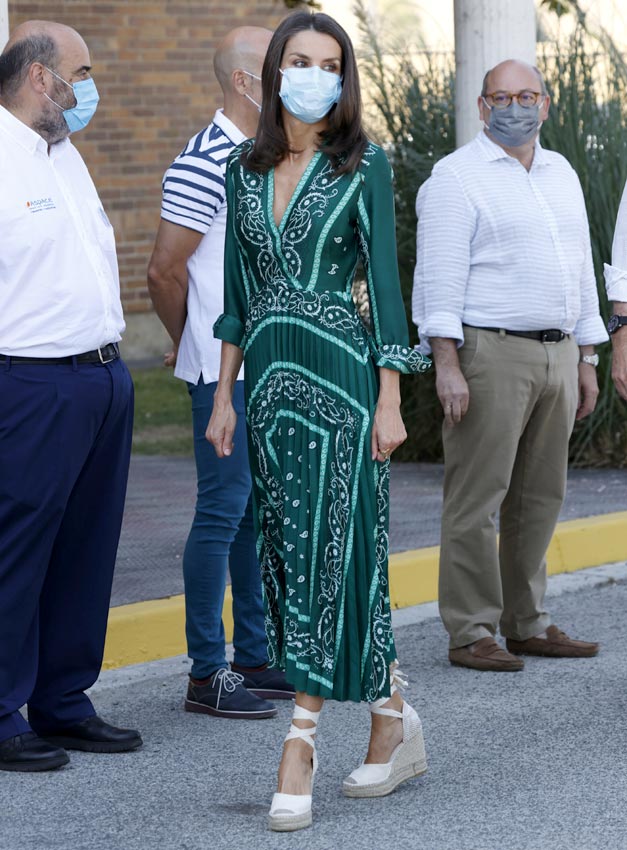 La visita de Felipe y Letizia a Navarra se dio el día 27 de julio, una visita que la Reina hizo con este vestido tipo pañuelo y estampado paisley. El vestido era de Sandro Paris y costaba entre 200 y 300 euros. Además, también llevó un calzado de color blanco, igual que el que llevó en Canarias.