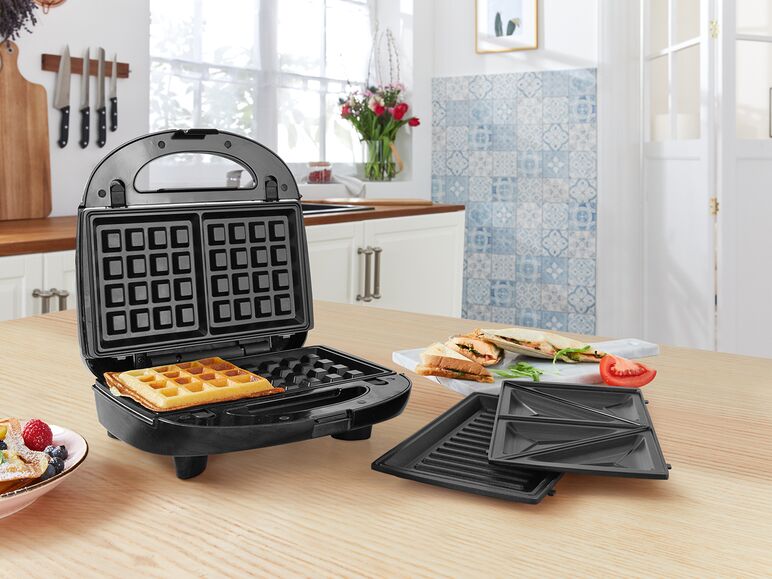 En Lidl, se ha vendido una en particular, esta con triple función, pues es sandwichera, parrilla y gofrera. Cuenta con placas intercambiables que son aptas para el lavavajillas y tienen revestimiento antiadherente de gran calidad. Además tiene un aviso luminoso, un piloto que indica verde y rojo.