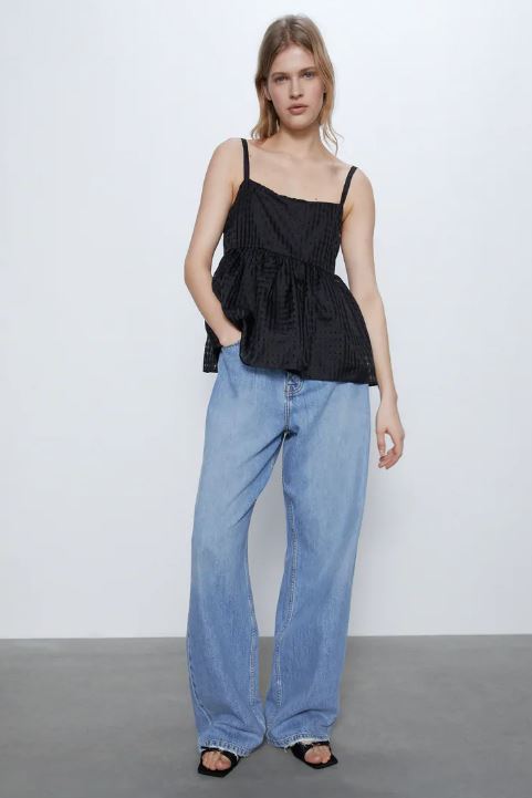 El último conjunto de Zara es este top organza de cuadros y color negro. Cuenta con un forro interior y un cierre lateral con cremallera oculta y cordón de espalda. Así mismo, tiene un bajo acabado en evasé, tirantes finos y escote recto.