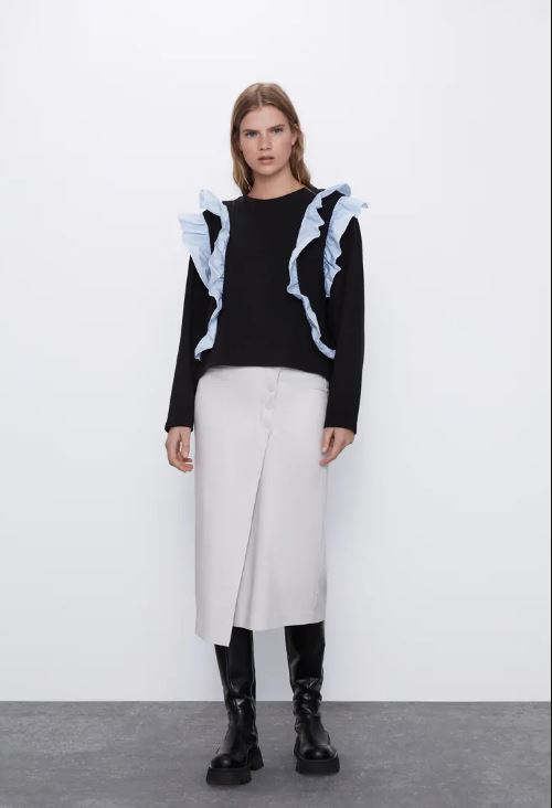 El siguiente conjunto es esta sudadera de cuello redondo y manga larga. Es de color negro y tiene un detalla que hace que el tejido esté combinado a contraste con los volantes. Está disponible en la talla S y en la talla M.