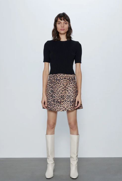 Ahora veremos esta falda mini con estampado de leopardo. La falda tiene línea evasé, un cierre en la espalda y la cremallera de cierre totalmente oculta en la costura. La podrás encontrar en la talla S, la talla M y la talla L.