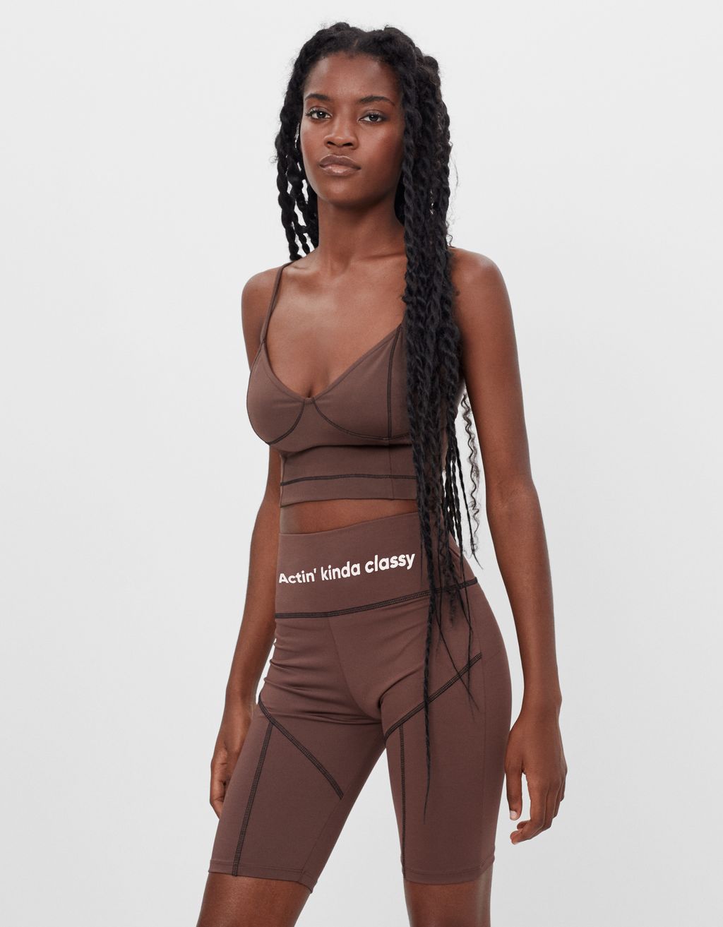 Bershka ha venido a marcar un antes y un después en estilo de vida de muchas personas en todo el orbe. Por eso, es que si de las mujeres hablamos, ellas siempre se dejan enamorar por lo que tiene Bershka en ventas, que es básicamente una muestra de lo que está en tendencia, y cualquier chica quisiera llevar consigo. Pues bien, no estás lejos de formar parte de este maravilloso ejército de la moda, con tan sólo 15,99 euros puedes incluir un pantalón ciclista lettering en color marrón.