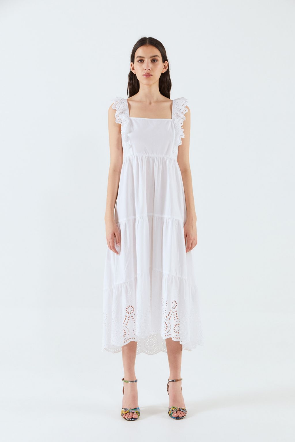 Tiene escote recto, tirantes y detalles de calado, lo que sienta de maravilla en los días de verano. En efecto, es un diseño largo, pero es tan amplio que no te sentirás agobiada. Si te convence, puedes encontrarlo entrando en este enlace. Además, el color blanco siempre es un acierto cuando se trata de buscar un look playero, aunque también lo tienes disponible en amarillo.