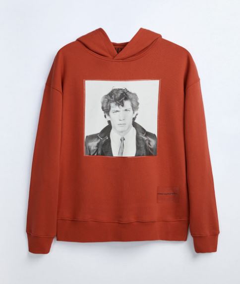 De nuevo, vamos a ver una prenda con estampación fotográfica de la fundación de Robert Mapplethorpe. En este caso, es una sudadera de color naranja quemado, con cuello con capucha, mangas largas y muy amplia.