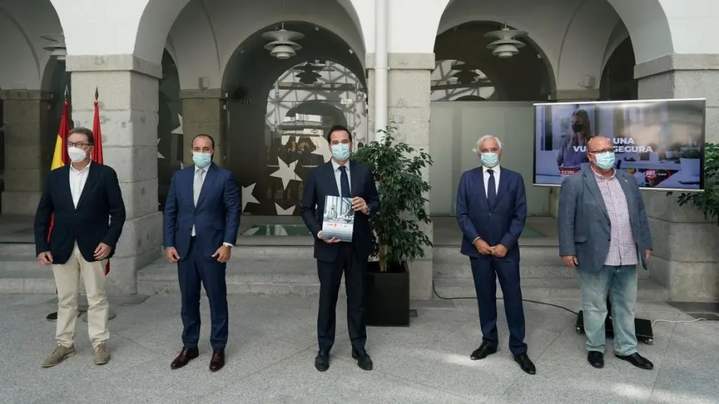 El vicepresidente de la Comunidad de Madrid, Ignacio Aguado, ha presentado hoy un protocolo de recomendaciones de «vuelta segura al trabajo». El objetivo es contribuir desde el ámbito laboral a fortalecer la protección de la salud de los madrileños y facilitar la incorporación al trabajo de forma segura. El acuerdo ha sido rubricado por el consejero de Economía, Empleo y Competitividad, Manuel Giménez; los secretarios generales de CC.OO. Madrid, Jaime Cedrún, y UGT Madrid, Luis Miguel López Reillo y el presidente de CEIM, Miguel Garrido.