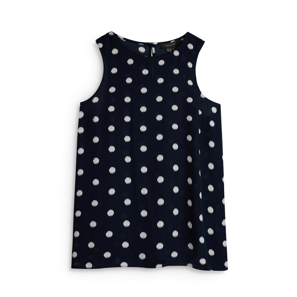 Esta blusa de fondo azul marino y lunares blancos es de cuello redondo y no tiene mangas, es amplia y muy cómoda. Su precio es también muy económico, como casi todo lo que puedes encontrar en Primark, solo son 5 euros.