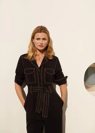 Terminamos esta lista de look s de oficina de Mango con un diseño que no puede encantarnos más. Se trata de un mono largo con lazada en la cintura, aunque esta no es la mejor parte del modelo. El diseño en color negro, y lo habitual es tratar que las costuras no se vena, y eso es lo que hace este mono tan especial.