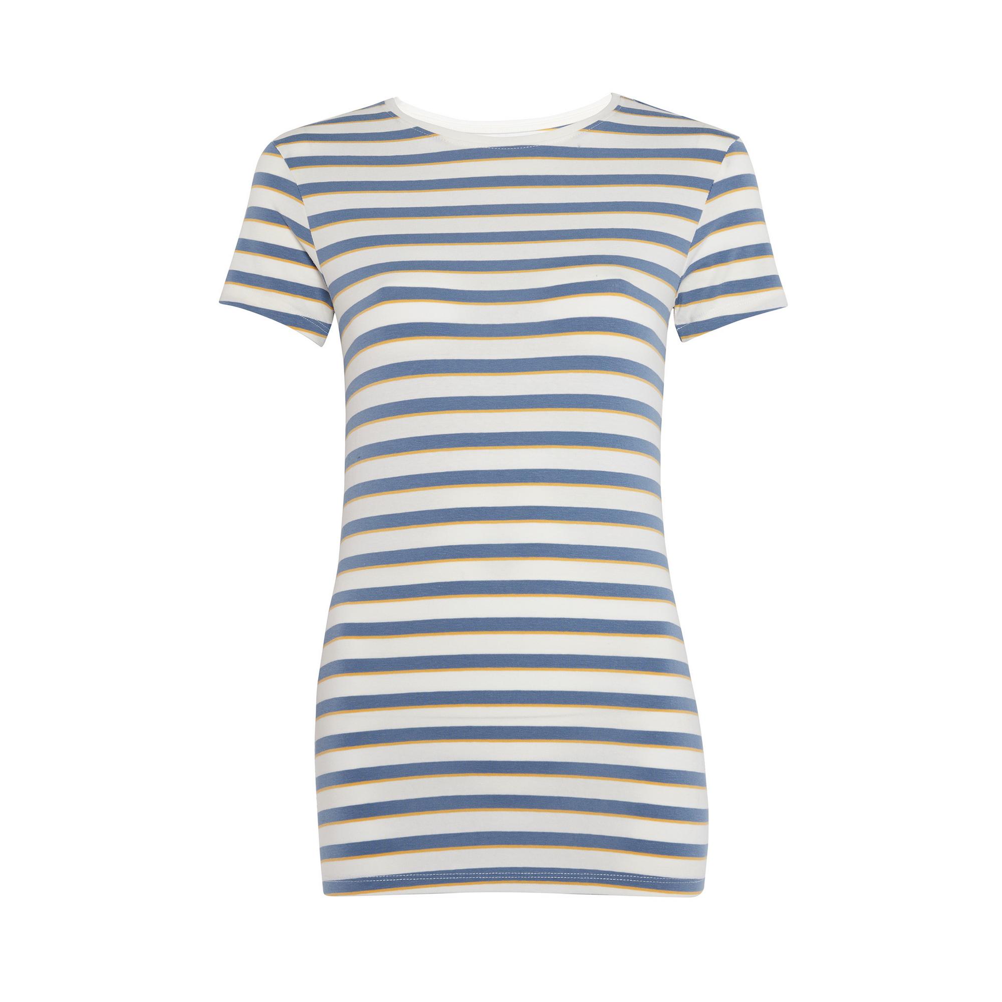 Es tan sencilla y tan bonita que se va a convertir en uno de tus básicos para este verano, y lo mejor es que tiene un precio de solo 4 euros. Se trata de una camiseta de corte clásico con manga corta y cuello caja. Con un estampado en rayas azules y blancas y unas líneas amarillas más estrechas. Perfecta para lucir un aire un poco marinero.