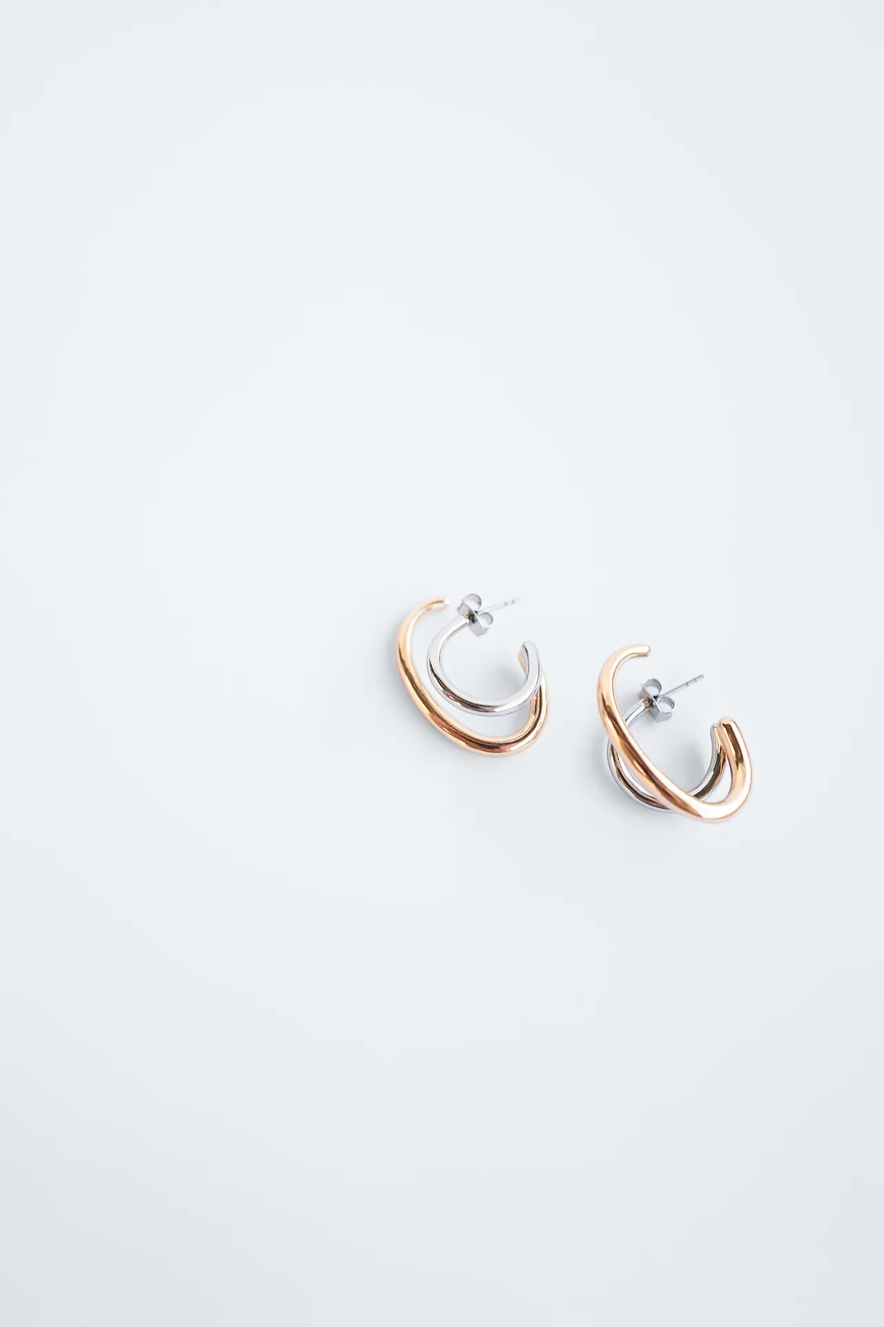En Zara tienes este diseño tan especial que complementa el oro con la plata, son aros pequeños y finos, por lo que no debes preocuparte de parecer vulgar. El precio de estos bonitos pendientes con cierre de tuerca es de 9,95 euros, y los puedes encontrar en este enlace.
