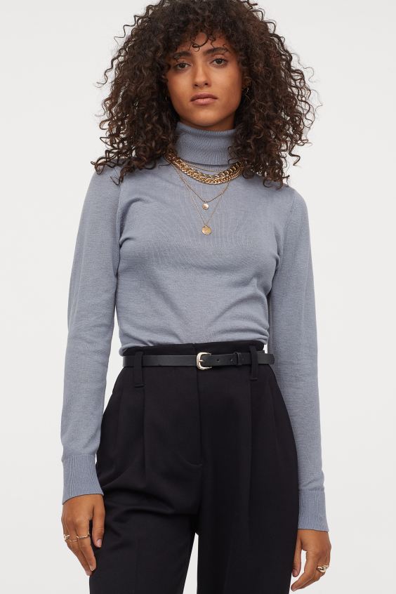 Una vez más H&M se las juega a ganar con este tipo de propuestas para las féminas, donde tienen la posibilidad de probar otras facetas que quizás desconocían. Aunque esto es bueno, de cara a que vayas tomando seguridad con la ropa. Dentro de las características, tenemos que se trata de un jersey entallado de cuello alto en punto fino vaporoso con lana.