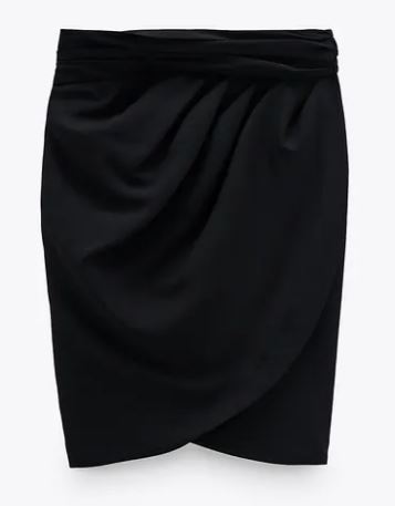Con esta falda mini drapeada tus looks estarán garantizados. Se trata de una falda mini de tiro alto con detalles de tejido drapeado en la cintura.