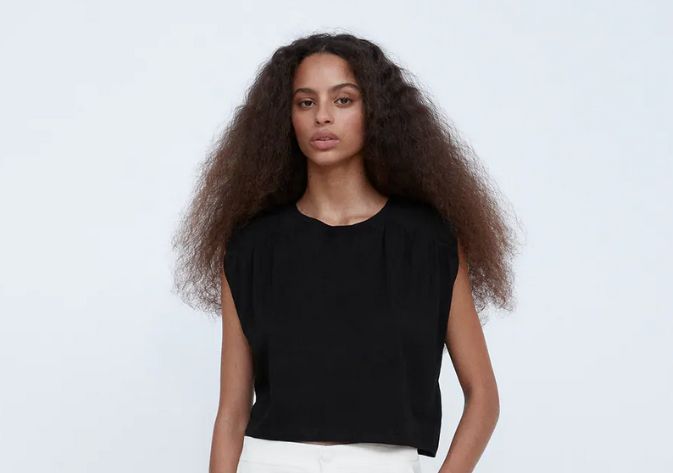 Otro modelo con hombreras. Si eres de los años noventa, hay dos elementos que te definen: sabes lo que es un walkman y llevaste hombreras. Aunque muchos reniegan ahora de ellas, las hombreras han vuelto y lo hacen por la puerta grande. Abandonan las líneas de chaquetas y camisas y se vuelven hacia las camisetas, como esta de Zara de cuello redondo y manga tipo sisa con hombreras muy marcadas.