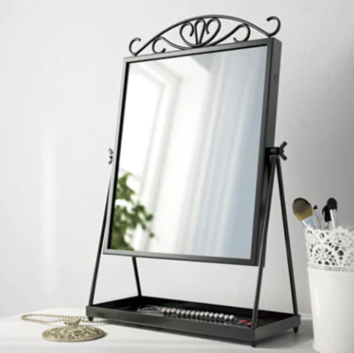 Este espejo de mesa de Ikea cuyo nombre es casi impronunciable, es un objeto muy útil ya que te permite retocarte cómodamente sin necesidad de tener un espejo demasiado grande ya que, además de que son más caros, suelen ocupar mucho espacio. Este espejo, además de ocupar poco sitio, es utilísimo ya que cuenta con una bandeja pequeña para poner toda clase de objetos como, por ejemplo, joyas.