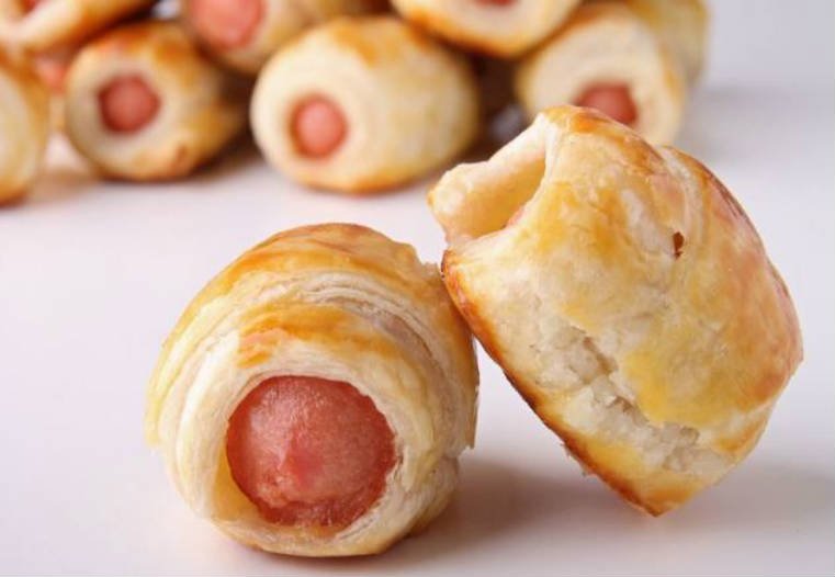 En un bol mezclas el queso con la salsa. Cortas la lámina de hojaldre en tres partes. En una de las tiras tienes que poner la mezcla de queso y las debes untar. Pones las salchichas encima, y en otra lámina haces el paso de untar con la mezcla y las aceitunas. Pintas con huevo y cierras las tiras para que queden en forma de rollo. Horneas a 180 grados hasta que veas que están doraditas.