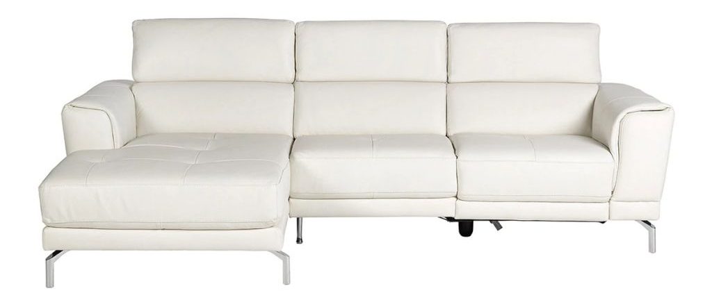 En este caso es un gran sofá con chaise longue. Con un asiento relax, estructura de madera de abeto, fibra de madera contrachapada, patas metálicas y revestimiento de piel suave. Un diseño cómodo y actual para tu salón, con varios acabados para elegir.