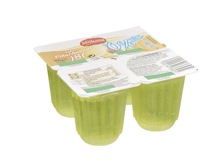 Se trata de un producto sin nada de azúcares, algo que hace que cada gelatina de 100 gramos tenga tan sólo 8 calorías, una cantidad bastante baja. Eso hace que puedas comer este producto sin preocuparte demasiado por engordar, algo que la gente que está dieta lo va a agradecer. Antes costaba 65 céntimos por cada paquete de 4 gelatinas, pero ahora cuesta 0,49, tanto en el sabor piña como en el sabor fresa.