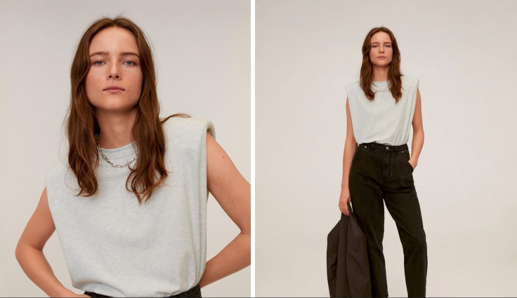 Por último, esta camiseta con hombreras también está a la venta online de forma exclusiva en Mango. Disponible en varias tallas y en color gris claro (antes también en gris oscuro).